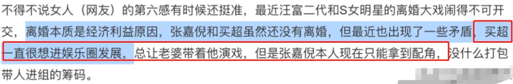 还有网友爆料,称买超和张嘉倪目前还没有离婚,但已经出现了一些矛盾,买超想进娱乐圈发展,但张嘉倪的咖位也不高,自己都拿不到好资源,更别说带着老公混了。