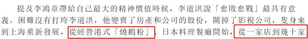 除了商演,李道洪还在上海开店卖烧鹅粉和日料,从一间店开到了几十间店,算是在内地发展得很好的港星了。