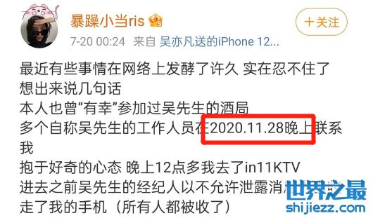 去年7月20日,“暴躁小当”加入锤吴亦凡的队伍,连发11张图实锤吴亦凡的不当行为。其中她提到“有幸”参加的酒局,就发生在2020年11月8日,与官方通报的吴亦凡作案时间(11月—12月)对上了。