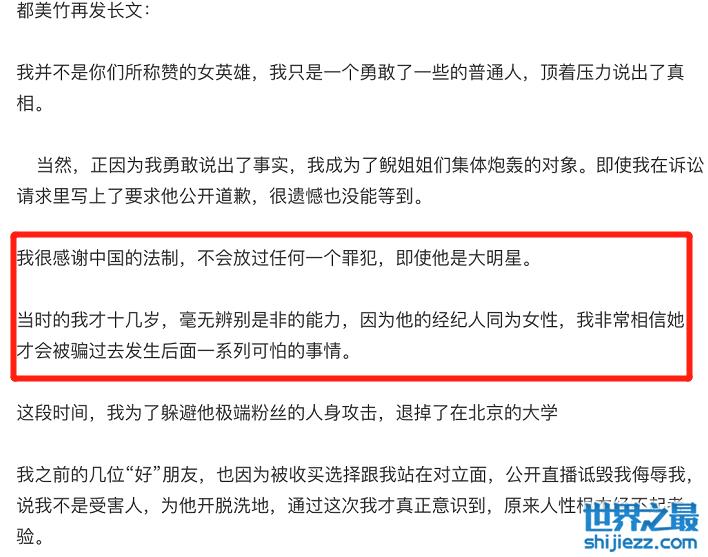 吴亦凡被判后,都美竹也发出长文,诉说这些时间来自己的心路历程,她和她们(其他受害者)其实都顶着很大压力:
