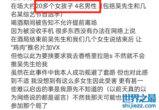 那场酒局里,全是由吴亦凡的工作人员哄骗而来的女孩,进场就被收走了手机。KTV里有20多个女孩子,4名男性,除了吴亦凡还有几名综艺节目的选手。当事人被其中一位名叫“鸡肉”的选手威胁陪shui,但她并没有让人得逞。