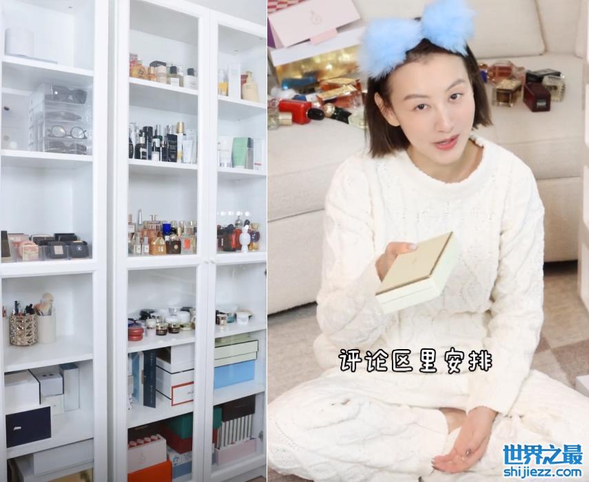 紧接着就是各类用具,从脸部按摩仪等电子仪器到各种香水、身体乳等等,品类繁多,一层铺满多排,大瓶物件放置了一整面墙,连郭晓敏自己都忍不住说整理完后像个商品房。