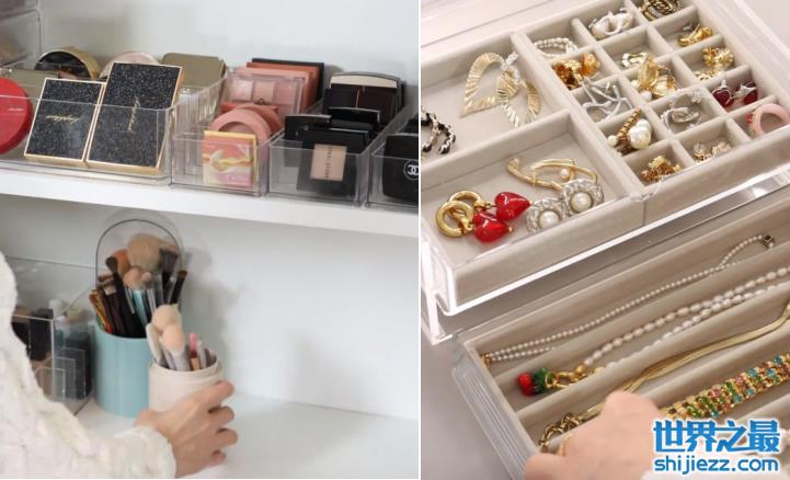素颜出镜的郭晓敏先从化妆品开始整理,将各类大品牌彩妆和平价彩妆,从口红、眼影、腮红再到粉底等分类整理,并放入特定的收纳盒。随后她便开始整理自己的项链、戒指等等配饰,将它们小心、整齐地放入首饰盒。