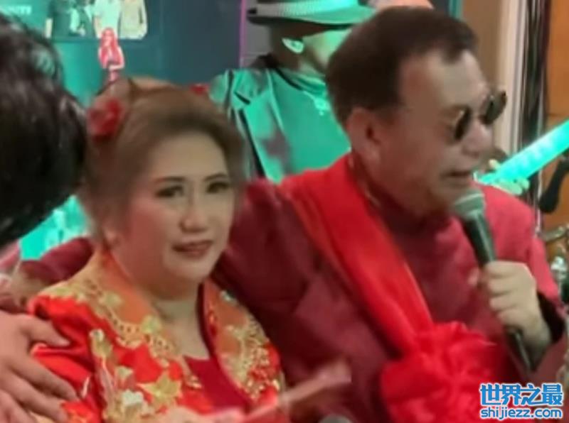 只见廖伟雄身穿暗红色的长褂,胸前还绑着一朵大红花,脸上还戴着一副墨镜,让人眼前一亮。而妻子杨慧玲则是身穿传统喜服,可以清晰地看见礼服上的金丝刺绣,她还披上了红盖头,由老公廖伟雄为她揭开。