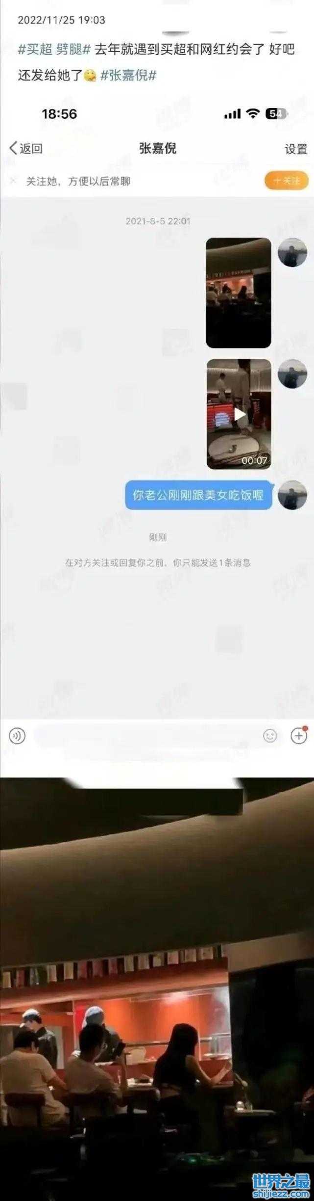 其实早在去年8月,就有网友偶遇买超和网红约会,该网友还拍了照片发给了张嘉倪。