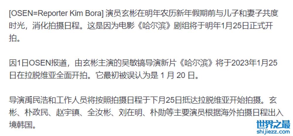 报道称,玄彬将在明年农历新年假期前与妻儿共度时光,暂停拍摄日程,这是因为电影《哈尔滨》剧组将于明年1月25日正式开拍,而之前被误认为是明年1月20日前往拉脱维亚开拍。
