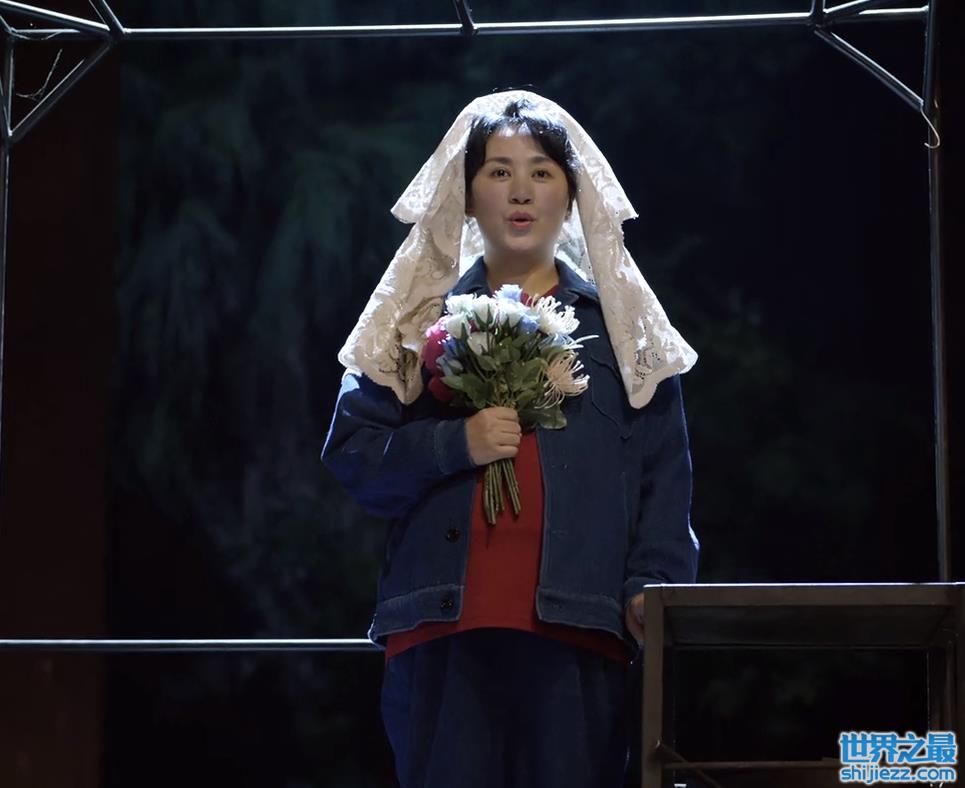 同时打算给老伍补办一个结婚仪式的陆春丽,头上戴着电视机的白色遮幕布,手拿紫罗兰花紧张到深呼吸。