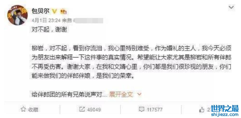 细数整个娱乐圈的明星婚礼,有高调奢华,也有朴实简单,不论形式如何,新人总是能得到所有人的祝福,唯独包贝尔包文婧的婚礼成了一个例外。