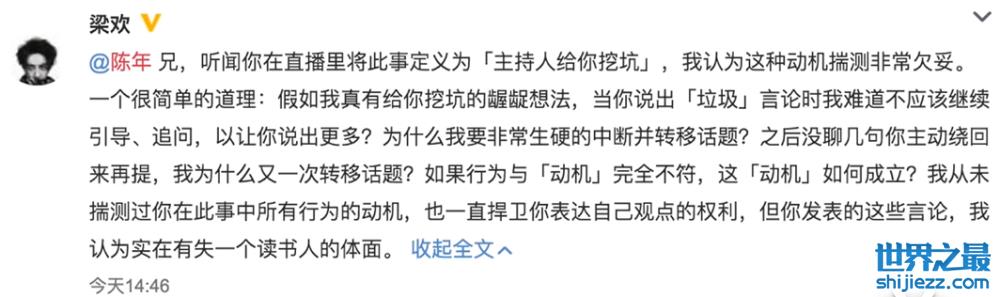 经不住粉丝们的声讨,最后甚至连节目主持人梁欢,都忍不住发声给陈年倒油...这一把陈年可以算是既丢了面子也失了里子。