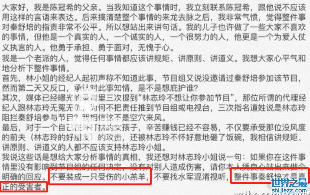 甚至连陈冠希的爸爸也亲自下场,发长文表示支持儿媳妇秦舒培,希望林志玲不要再装“受伤的小绵羊”