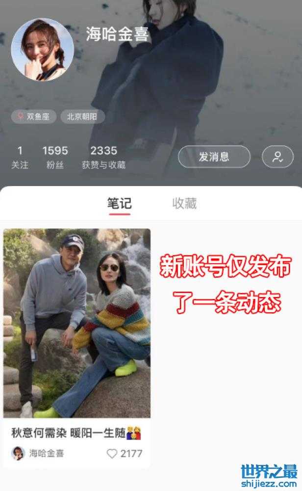 就在大家热议的同时,有网友发现海哈金喜不仅在视频账号中分享了这组照片,还开通了新账号,入驻某书发布了同样的文案和同样的照片,也只发布了这一条动态。