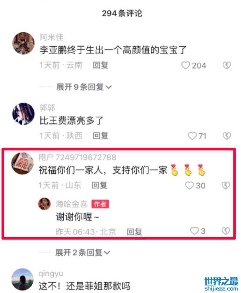 在海哈金喜晒出一家三口合影后,她还回复了网友动态,在那么多留言中她挑选了一条“祝福你们一家人,支持你们一家人”的留言,她给予了谢谢回应。