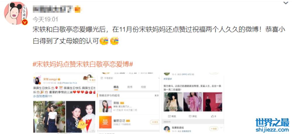 在其点赞的历史动态中可以看出,宋妈妈11月曾点赞了一条有关女儿与白敬亭的恋情动态,这位博主还将宋轶美誉为“全网的嫂子”,并衷心祝愿她与小白可以幸福久久。