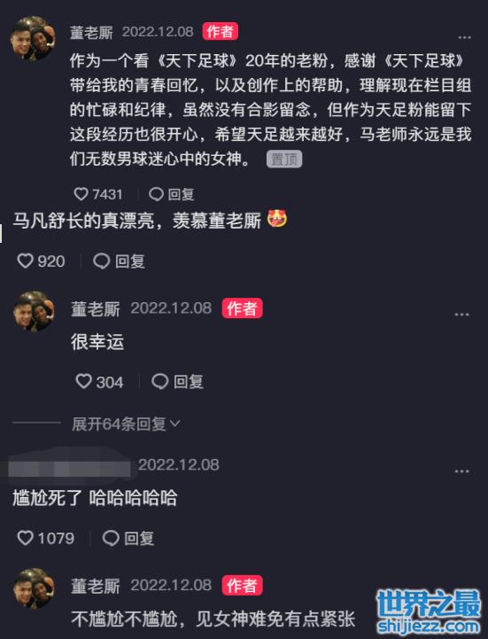 对于董老厮这次的偶遇,评论区也是炸开了锅。先是董老厮自身表示,自己一直都是《天下足球》栏目的粉丝,能够理解栏目组的忙碌和纪律,虽然没有能够和马凡舒合影留念,但仍然是栏目组的粉丝。