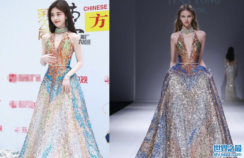 原版是深V裙,从脖子开到肚脐,鞠婧祎可能是对自己身材不够自信,把领口收口处提高到了胸部。这么一缝一收口,确实让胸部聚拢了,可礼裙的高级感也荡然无存。