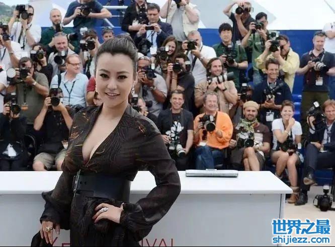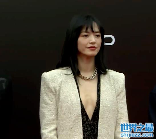 张天爱今年红毯也大胆地穿了深V礼裙,那衣领都快开到肚脐眼了。