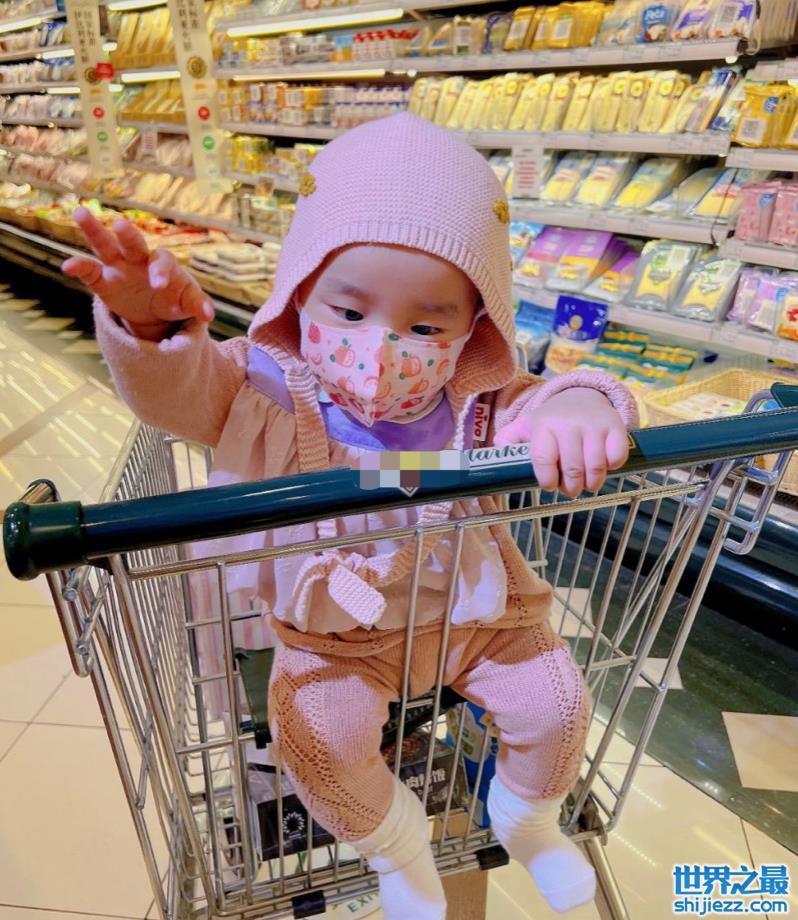 小宝贝当天打扮十分嫩粉,穿着针织毛衣小小只特别可爱,戴着儿童款桃子口罩十分软萌,坐在购物车里小手扑腾,让人忍不住想抱在怀里。可以看到,女儿虽然是单眼皮但眼睛也不小,露出来的五官看起来像爸爸也像妈妈。