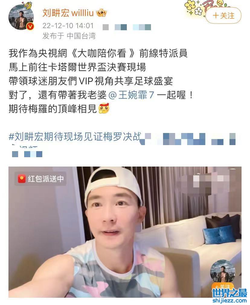 近日,刘畊宏发了最新动态,称自己将成为《大咖陪你看》的前线特派员,前往卡塔尔世界杯决赛现场,与大家连线用VIP视角共享足球盛宴。