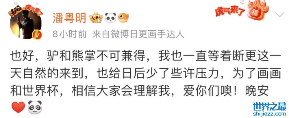 同为老球迷的演员潘粤明也发布动态,表示自己日后会断更动态,为了画画和世界杯,相信自己的决定能得到大家的理解。