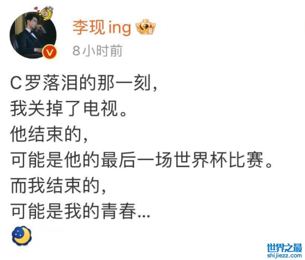 葡萄牙队遗憾失利之后,不少明星艺人也纷纷更新动态发表感慨,作为C罗铁粉的李现在文中表示,在C罗落泪的那一刻,自己关掉了电视,C罗结束的可能是他在世界杯上的最后一战,但对他而言结束的确是自己的青春。