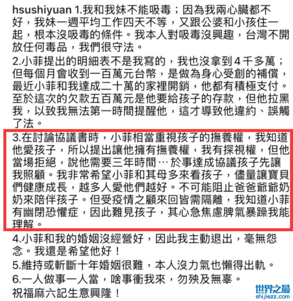 之前,面对汪小菲的隔空喊话,大S一度发文予以回应,在长文中明确提到汪小菲曾放弃对孩子的抚养权,原因是对方声称自己需要三年的创业时间,根本没时间照顾孩子,所以最终两个孩子由大S照顾与抚养。
