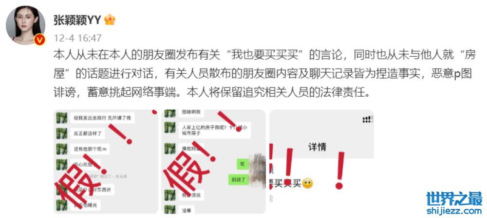 事后张颖颖做出澄清,声称网络上流传的她的聊天记录以及朋友圈动态均为不实信息,但依旧堵不住广大网友的悠悠之口。