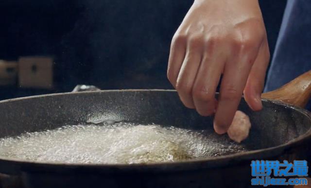 高温下的油发出【滋滋啦啦】的声音,当捏好的丸子下锅的那一刻,肉丸与热油发生神奇的化学反应,仿佛一朵花在悄然盛开。