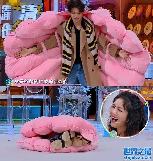 面对杨迪准备的超大版礼物,黄明昊又以身试礼物,在舞台上直接化身超大蚌壳精,甚至还直接躺在地上。
