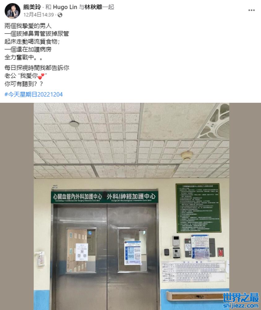 在此过程中,林秋离的太太熊美玲一直借助社交账号来透露老公的最新病情,据了解,11月29日,父子俩接受了肝移植手术,然而林秋离术后却出现异常,12月3日又接受了一次手术,当时熊美玲还发文表示,老公林秋离的凝血功能很不好,黄胆指数过高,情况让人无比忧心。