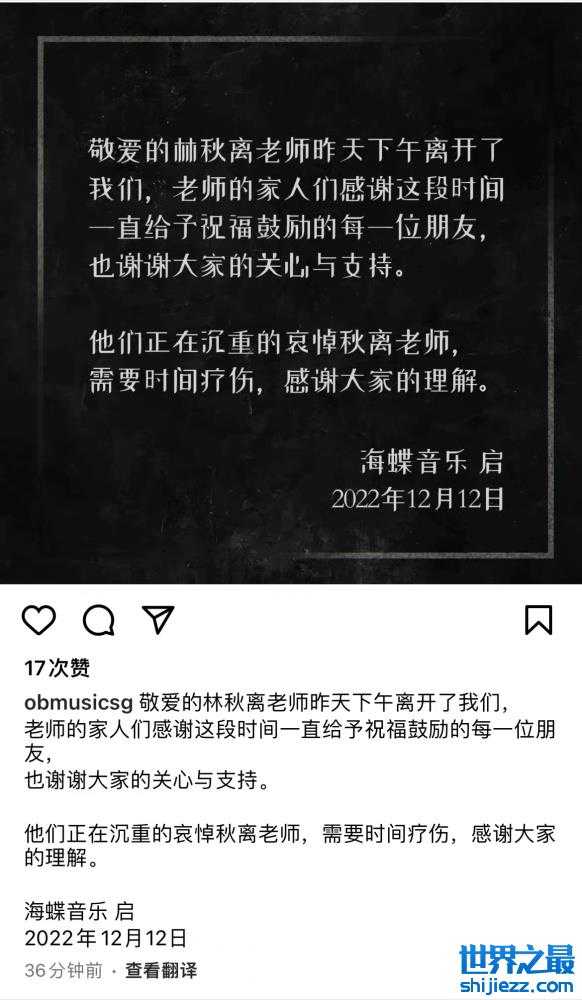 林秋离最后露面是11月25日,从画面看他当时的情况还没有很糟糕,然而仅仅过了半个月病情就开始恶化,最终还是离开了。