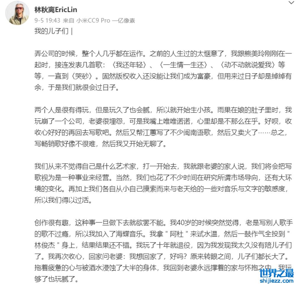 回看林秋离的社交账号,其生前最后一次更新停留在今年9月5日,当时的他发布了一篇长文日记,讲述了自己与妻子熊美玲努力打拼的励志经历,还分享了自己患病之后的所思所想。