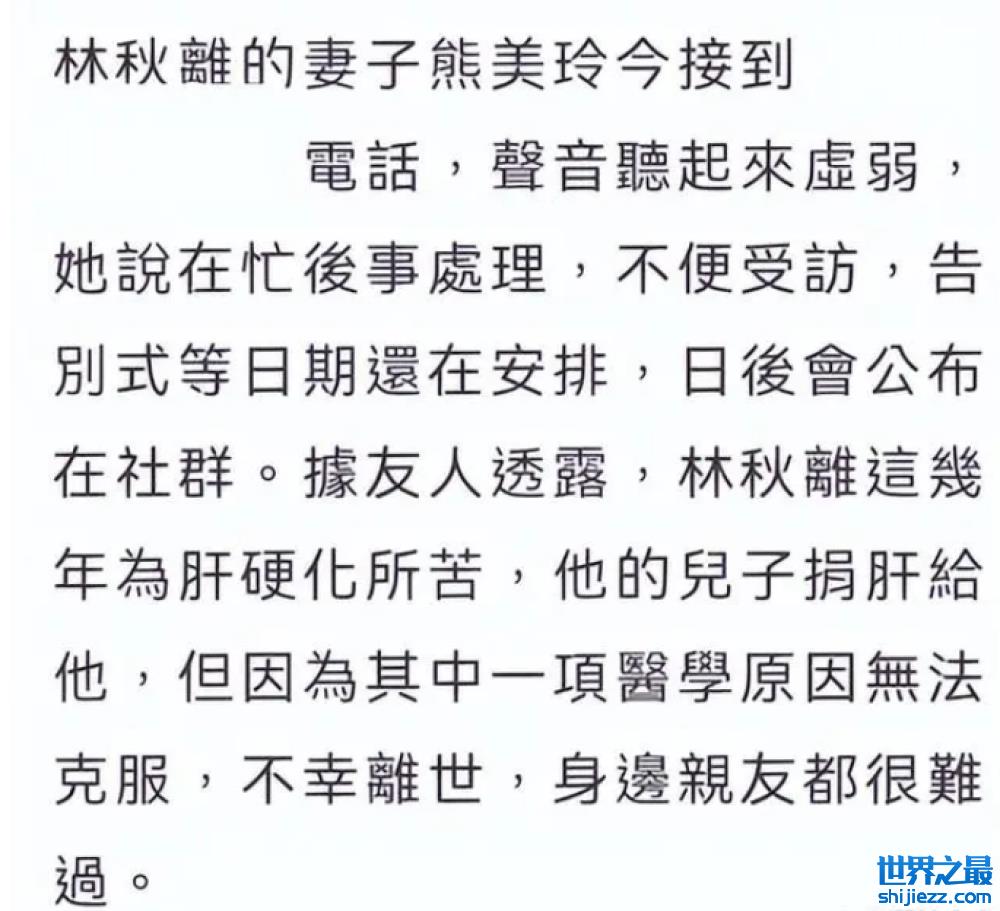 其长子为了保全父亲林秋离的生命,自愿捐肝接受移植手术,前些时日手术刚刚结束,不知是否是因为术后出现严重的排异症状,在手术后的第11天,在家人的竭力挽留之下,林秋离还是匆匆离开人世。