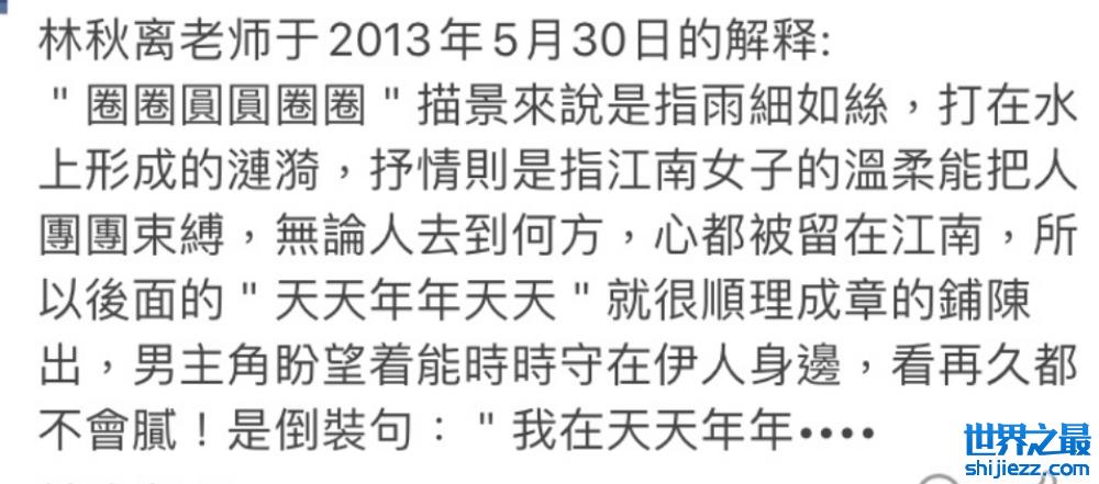 因为争议的声音太大,甚至连古风歌手许嵩都站出来为林秋离解释,其实这圈圈圆圆圈圈,说的就是在江南水乡下雨水时,水滴所泛起的涟漪。