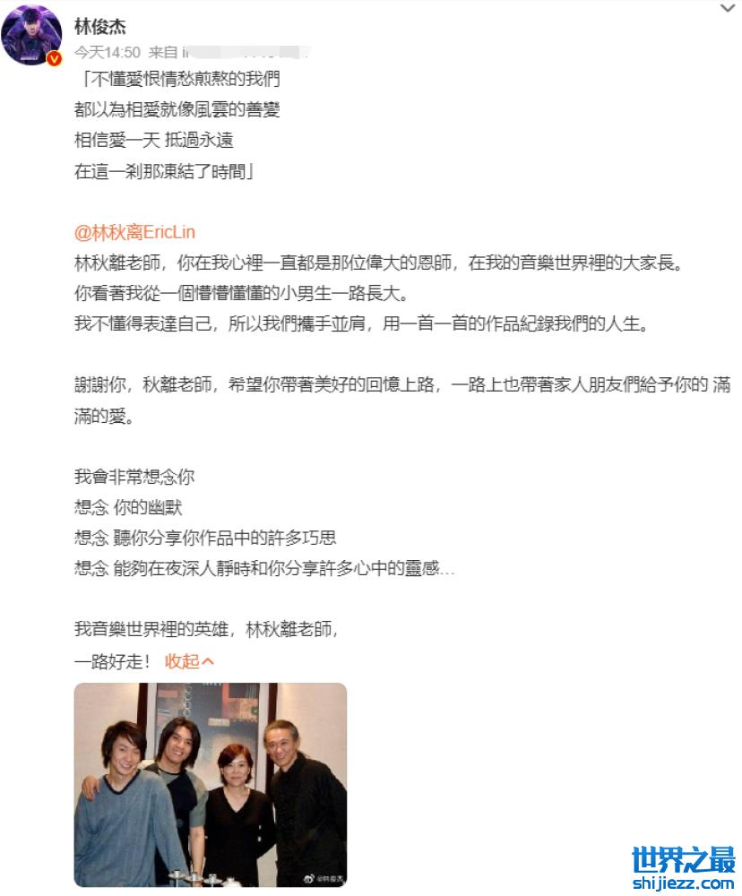 以及我们最为熟悉的华语乐坛天王之一林俊杰,也在得知消息之后,他也第一时间透过经纪人表达了自己对恩师离世的痛心和不舍。