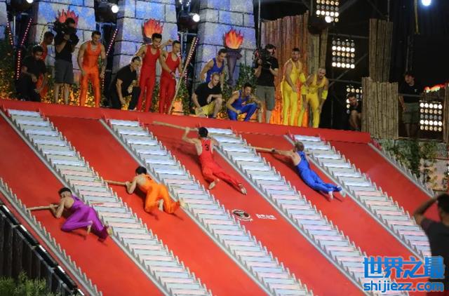 穿着紧身体操服的肌肉猛男,拿着一根棍子,依靠着手臂的力量向斜坡上攀爬,用时最少的队伍获胜。