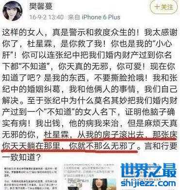 当时樊馨蔓直接指名道姓的怒,其中透露出了不少信息,例如自己和张纪中离婚的事情,杜星霖在插手,还有杜星霖住在自己的房子里,躺在自己的床上。