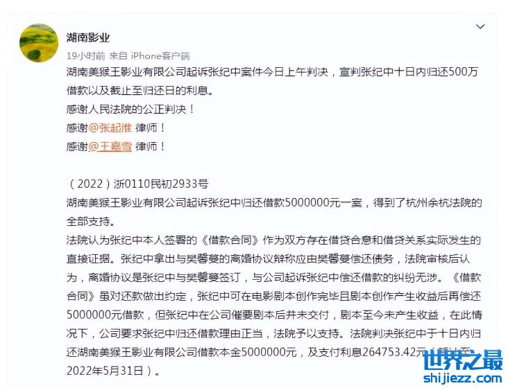 近日,湖南影业官方账号晒出了湖南美猴王影业起诉张纪中的判决结果:张纪中需在10日内日归还500万的借款以及利息。