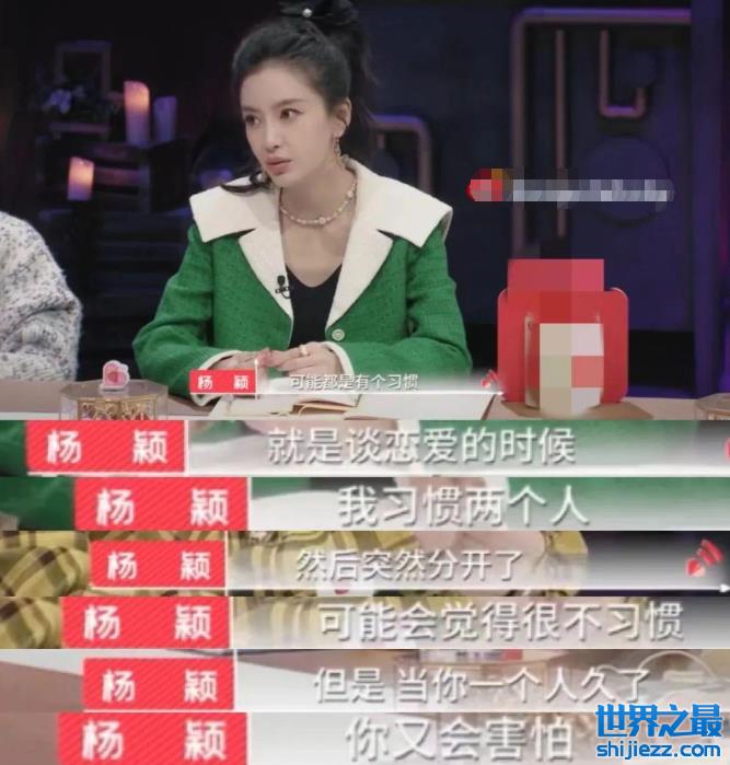 在谈到“单身越久,开启一段新恋情是否更难”的话题时,杨颖说自己从前谈恋爱的时候,习惯了两个人的生活,分开之后就会觉得不习惯,但后来适应了一个人的生活,就会越来越害怕去开启一段新恋情,因为你会害怕,回到两个人的生活,最后会不会重蹈覆辙。
