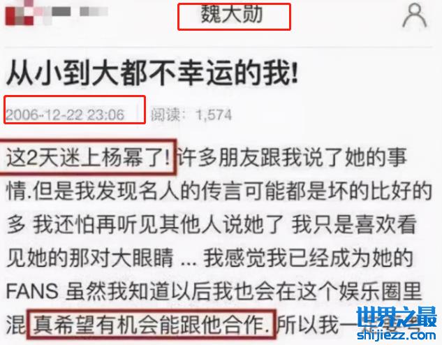 Y姓女星则指杨幂,魏大勋对杨幂可谓“一往情深”,在2006年时就在网上表达过自己对幂姐的迷恋,他考入北电也是为了杨幂。