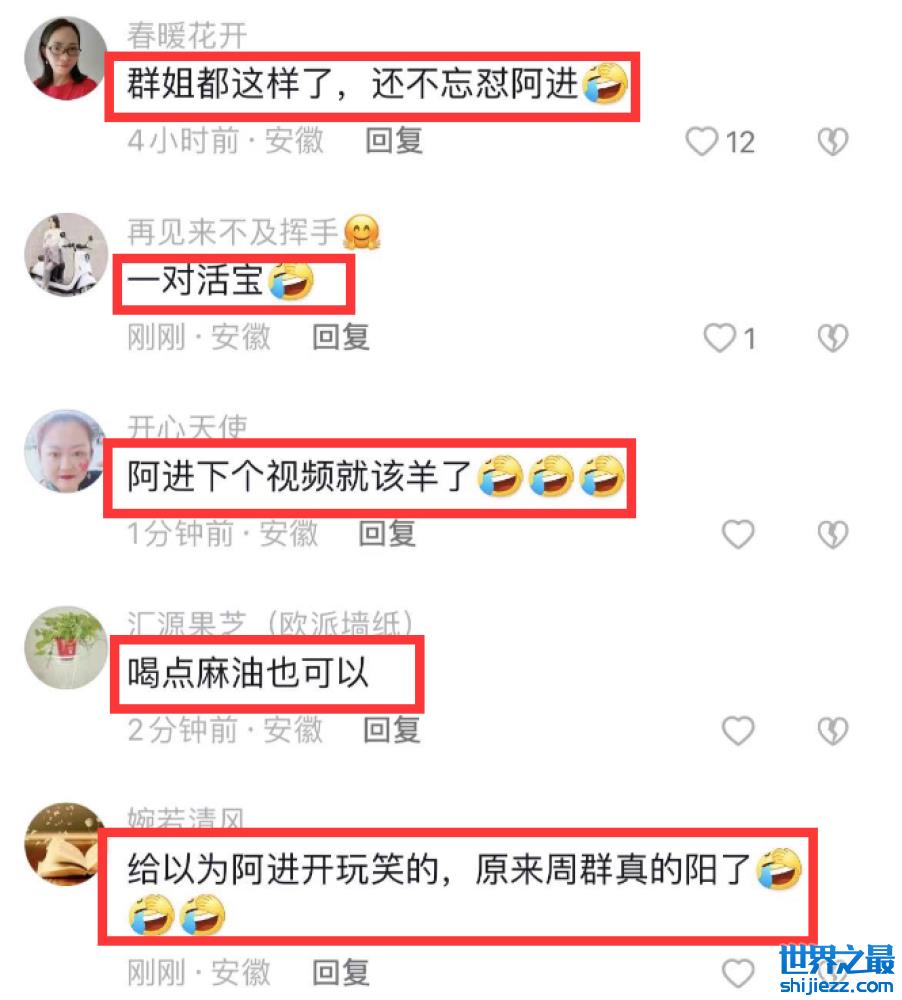 在视频的最后,周群再次补充说自己嗓子可疼了,感觉她有些支撑不住了,不过,她的心态是比较好的,视频中还不忘“怼”阿进,两人像活宝一样给网友带来不少快乐。