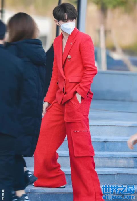 TFBOYS的师弟丁程鑫大概是现场年龄最小的,一身红西装很有个性,而且还是真空的,看来20岁的小伙子确实不怕冷。
