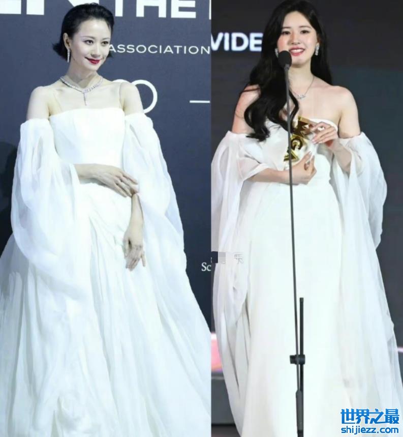除了这套性感睡衣,倪虹洁在这场红毯上还有一套白色的纱裙,在工作室放出的照片中,看得出来仙气飘飘,一黑一白,反差极大。