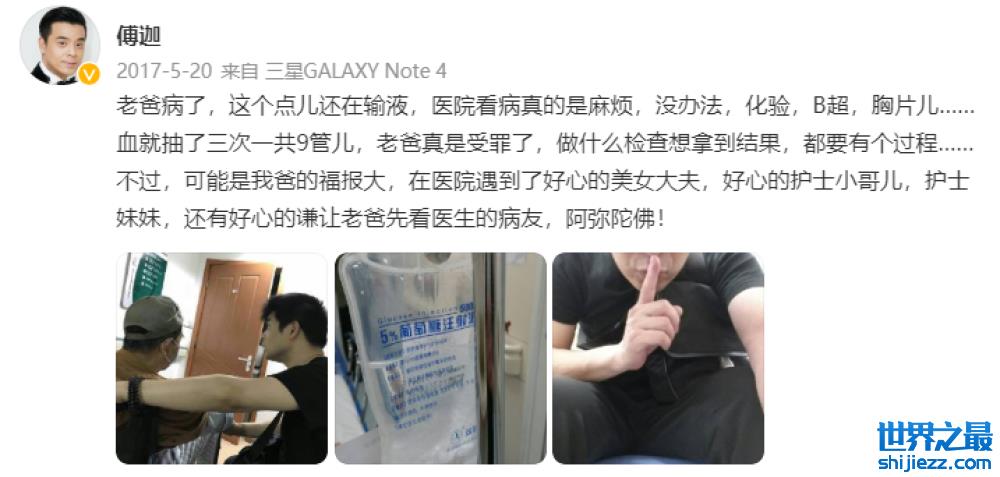 翻看傅迦的昔日动态可以得知,2017年,傅祖成就曾因身体患病入院治疗,当时的傅迦带着父亲来到医院接受了全面系统的检查,所幸那次一家人遇到了热心的医务工作者,获得了好心人的帮衬,从晒出的照片来看,几年前的傅祖成就已经身体欠佳,身子骨远不如早年看上去硬朗壮实。