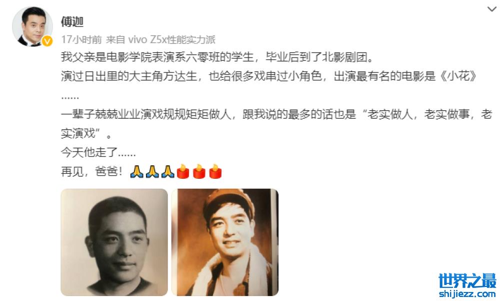 身为儿子的傅迦用这样的话来概括父亲傅祖成的一生“一辈子兢兢业业演戏,规规矩矩做人”,父亲生前对跟他说过最多的话也是“老实做人,老实做事,老实演戏,可见傅祖成也相当注重对儿子的品格教育,除了深情并茂的配文之外,傅迦还晒出两张父亲年轻时的帅照,照片中的傅祖成看上去儒雅俊朗,一身正气。