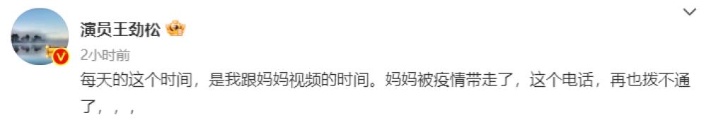 12月21日晚,老戏骨王劲松悲痛发文,告知网友他的妈妈被疫情带走了,妈妈的电话再也拨不通了,言语中尽显悲伤与无奈。