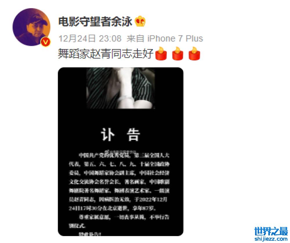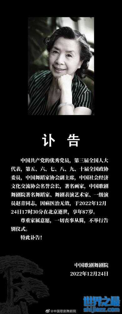 12月24日晚,中国歌剧舞剧院对外发布讣告,著名舞蹈家、舞剧表演艺术家、一级演员赵青同志因病医治无效,享年87岁。尊重家属意愿,一切丧事从简,不举行告别仪式。