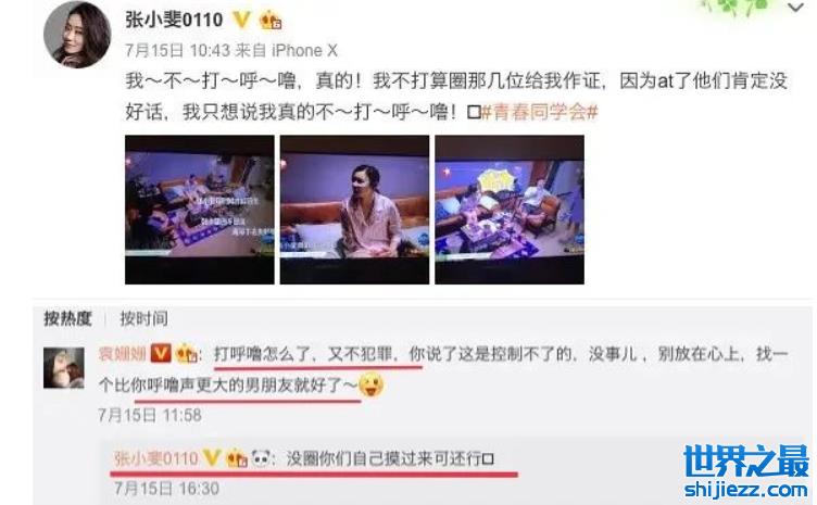 本以为事情就这么过去,没想到,这期节目播出后,张小斐打呼噜的话题,被网友热议。她无奈发文,否认打呼噜。袁姗姗去评论区留言,让她找个呼噜声更大的男朋友,张小斐百口莫辩,“没圈你们就自己摸过来了”。