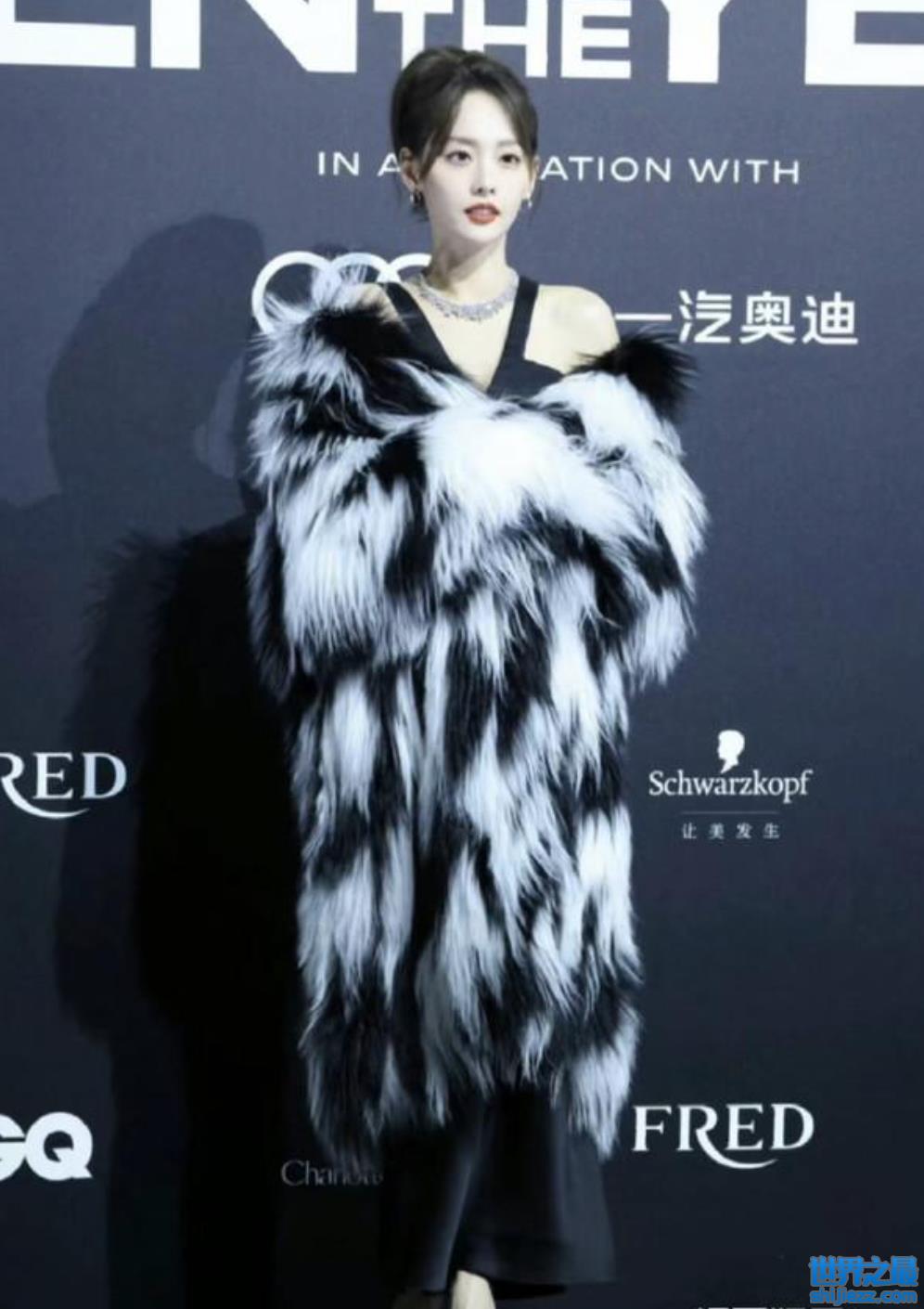 本来这个裙子单穿就已经很漂亮了,张嘉倪还在裙子外面搭配了一件宽松的皮草外套。