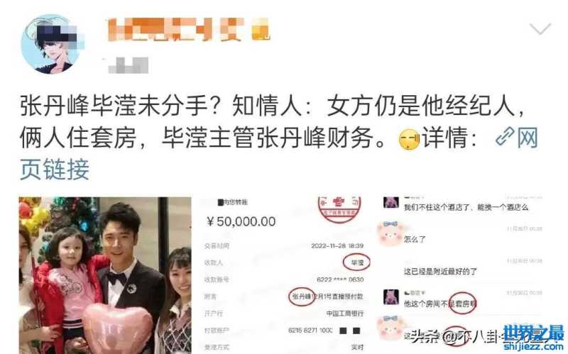 根据他的报道,张丹峰目前在做直播,收款人是毕滢,两人还住套房。