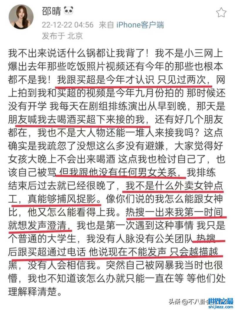 前段时间,买超出轨的瓜,可谓是轰动一时。没想到,时隔多日,居然有了新进展。邵晴发长文,否认她是小三,称她和买超今年才认识,只见过两次面,没有任何男女关系。新闻曝出后,她本想第一时间澄清,是买超告诉她会越描越黑,她才拖到现在。